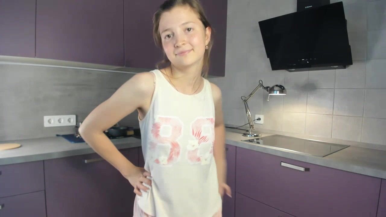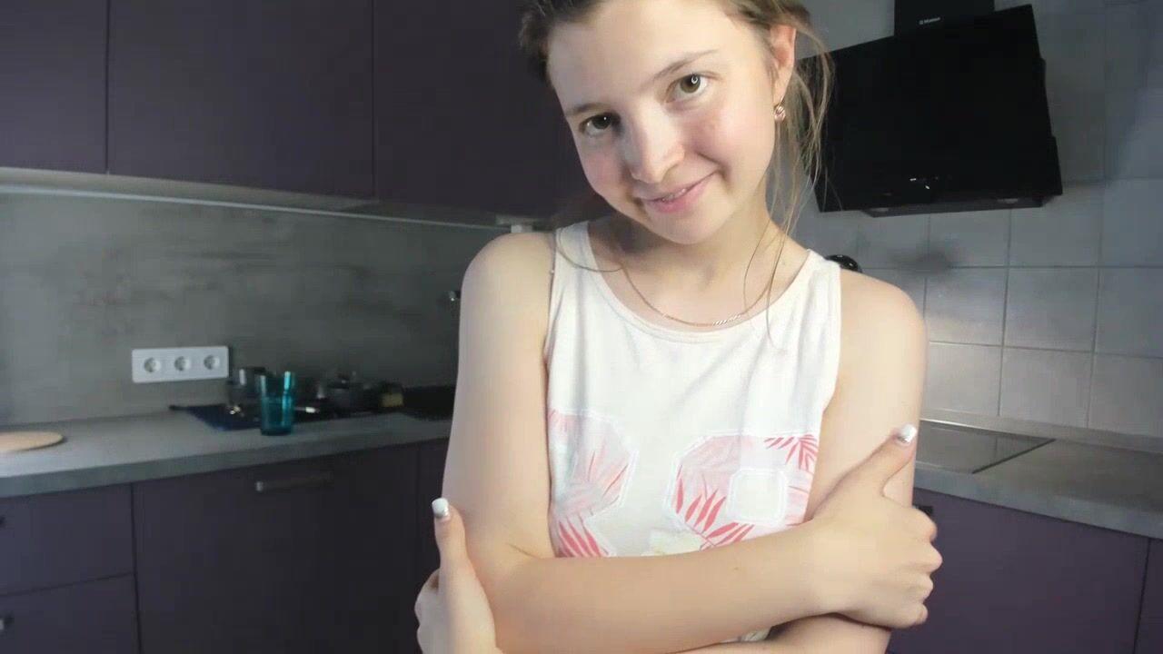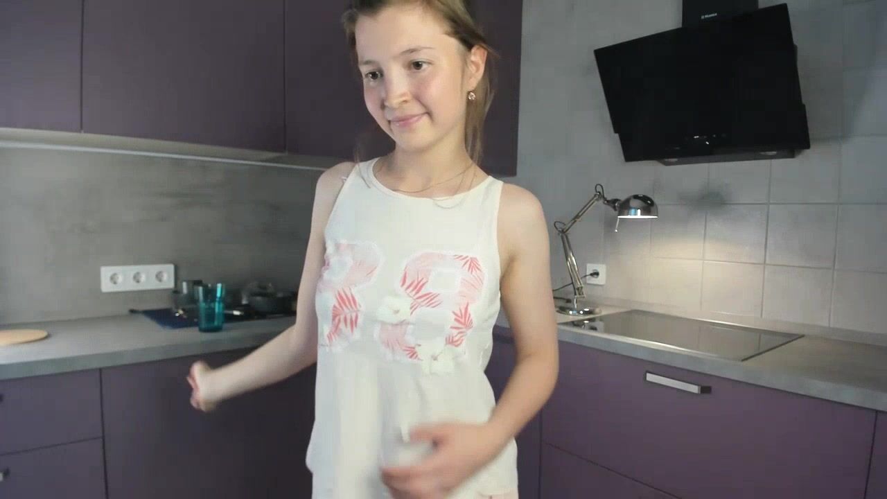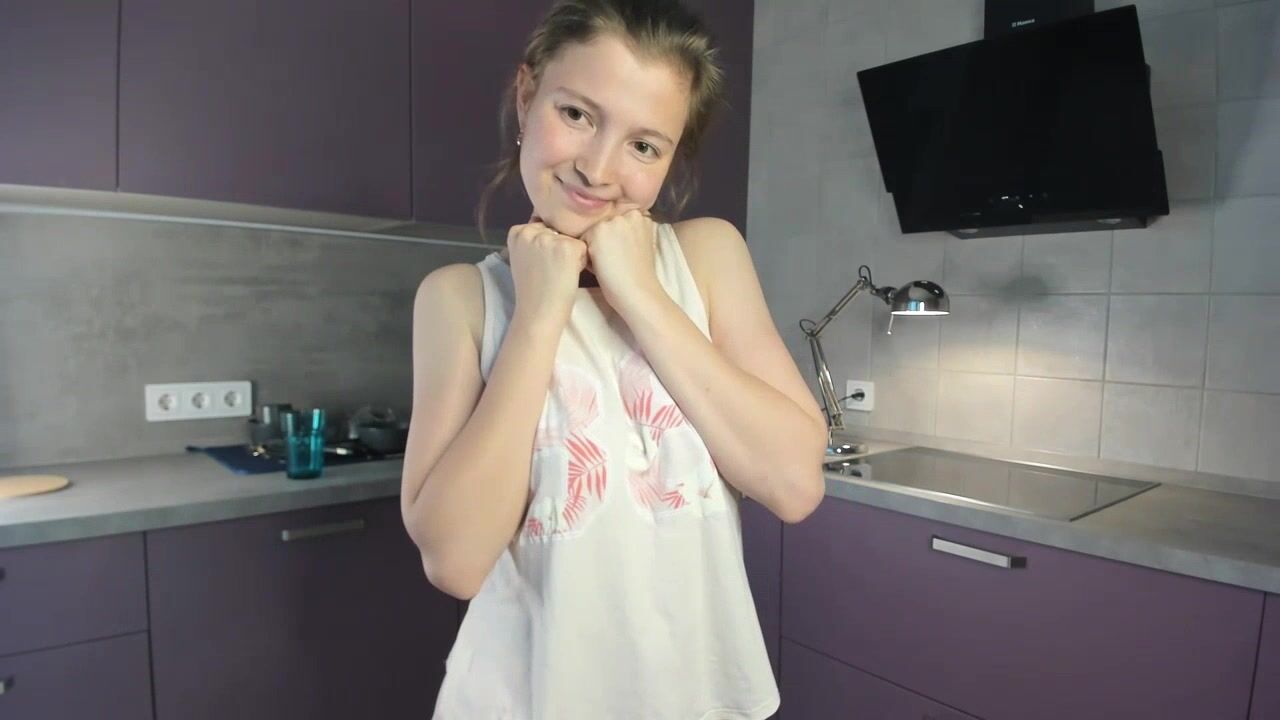 EmmaBacker cute housewife in the kitchen dancing with her clothes on and shy to undress.