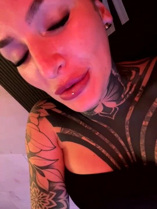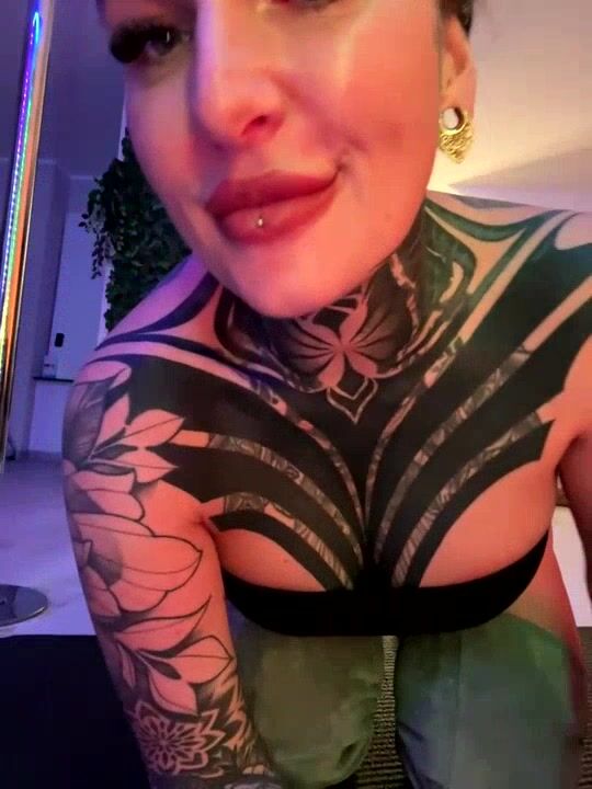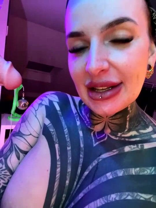 InkedBiitch Brunette in tattoos sweetly chatting and sucking a rubber cock on camera